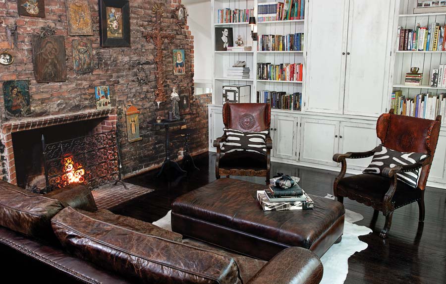 Room to Relax | A distressed leather Ralph Lauren sofa and two antique chairs hold center stage in the cozy library.