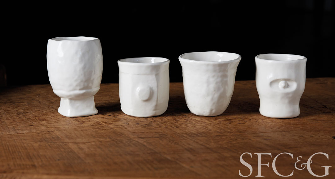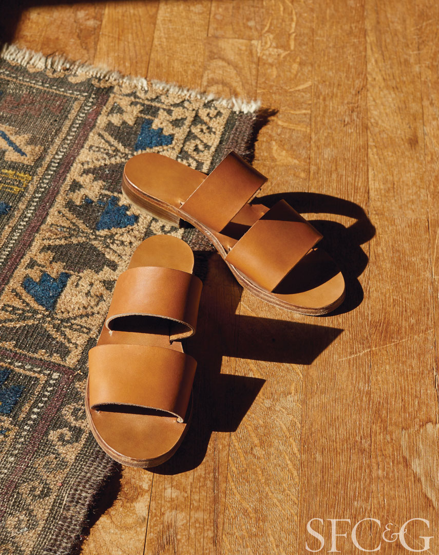 Permanent Collection’s artful, understated sensibility extends to accessories and objects for the home as well. The handmade leather Attal slip-ons, “based on sandals from a secondhand shop in Oregon,” says Singer, are comprised of two unadorned bands of leather and zero hardware. And rounding out the collection is an exquisite series of four white slip-cast cups based on the original designs of Nielsen’s father—now made by Atelier Dion in Oakland—that pay homage to “the timeless quality of his designs, ones that are ancient and completely modern at the same time,” says Nielson.
