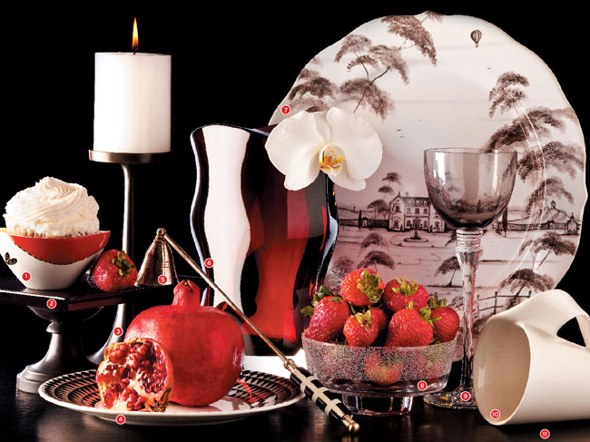 Everything looks better in basic black … and white (with a touch of red) <1> Small Wonder Indian Temple dip bowl, three bowls with tray, $90, from Diane von Furstenberg, dvf.com. <2> Black Out Geneva 8-inch cake stand in matte black, $36, the Martha Stewart Collection at Macy’s, macys.com. <3> Old Flame Bryce medium antiqued candleholder, $11.95, from Crate & Barrel,1200 Post Rd., Westport, 203-222-9500, crateandbarrel.com. <4> Optical Allusion Mosaic salad plate in black, $20, by Jasper Conran at Wedgwood, na.wwrd.com. <5> Up to Snuff Zanzibar bone candle snuffer, $21, through Lillian August, 32 Knight St., Norwalk, 203-847-3314, lillianaugust.com. <6> Right on Red Pacifique vase in ruby, $1,500, from Baccarat, 238 Greenwich Ave., Greenwich, 203-618-0900, baccarat.com. <7> Home Plate Stoneware charger in the Country Estate pattern, $89, from Juliska, 465 Canal St., Stamford, 203-316-0212, juliska.com. <8> Crystal Clear Divine crystal bowl, $120, from Orrefors, orrefors.us. <9> Perfect Pairing Saint Louis Grand Lieu wine goblet in slate/flannel gray, $240, through Lux, Bond & Green, 46 LaSalle Rd., West Hartford, 860-521-3015, lbgreen.com. <10> Light and Sweet New Wave caffé cup, $13.50, from Villeroy & Boch, villeroy-boch.com. <11> Your Serve High-gloss wood cocktail table with twin trays, $1,700, through Lillian August.