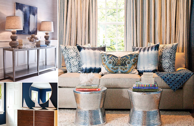 What is your take on using metallics with blues? Metallic accents add shine and a feeling of opulence to any space within your home. But a little goes a long way—sprinkle a bit of distressed antiqued silver throughout your blue decor. An oversized tray, a pair of bedside lamps, one vintage mirror…select your favorite. The sparkle adds dimension.