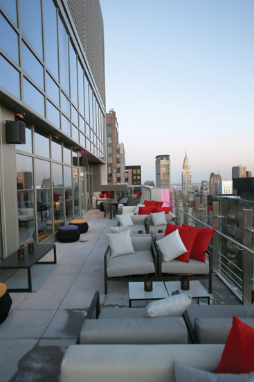 Scene: This beautifully decorated terrace on the Hudson Hotel’s 15th floor features whimsically oversize potted plants (courtesy of designer Philippe Starck), chaise longues, and Hudson River views.