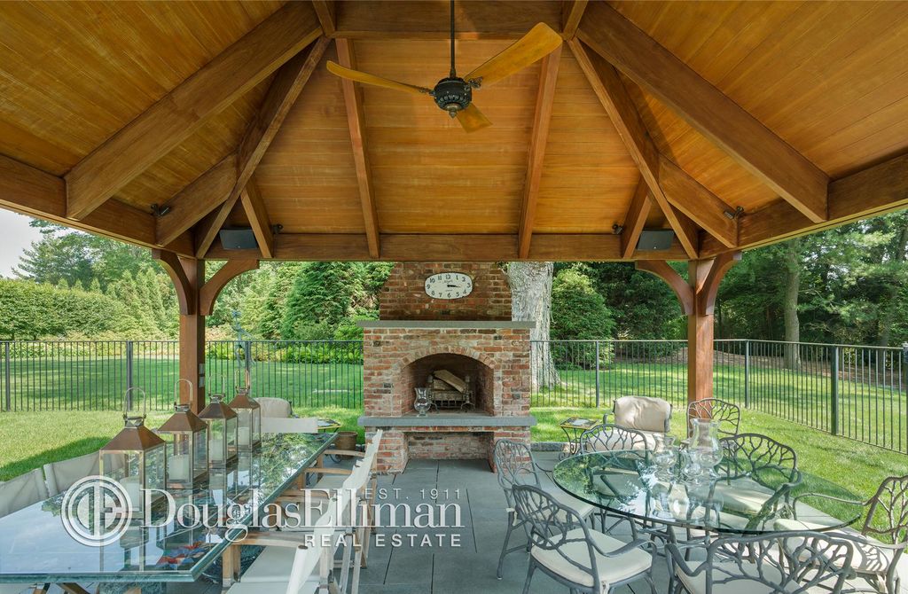 The pavilion features an outdoor fireplace and room for outdoor entertaining.