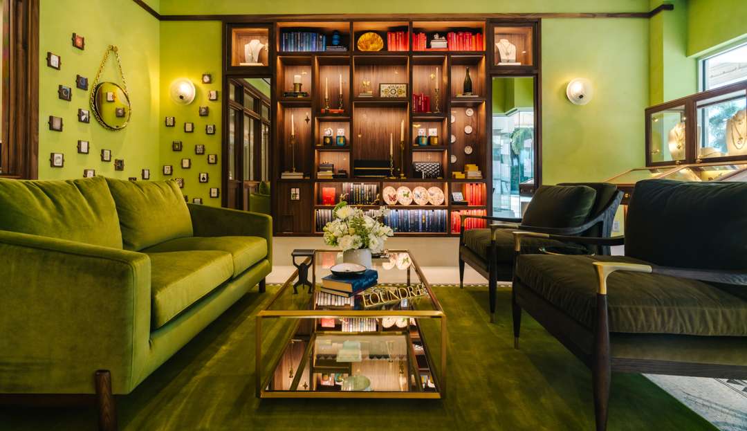 Just off of Worth Avenue on South County Road, FoundRae has opened a sixth boutique—its second in Florida. The store (dubbed the “golden solarium”) has a unique triangular footprint and is clad in rich green furnishings. Even in the mosaic floor, the brand’s lexicon shine through: A Roman numeral seven represents the seven types of true love, the number eight represents karma, a star represents strength. One wall features verre églomisé panels, adorned with palms.