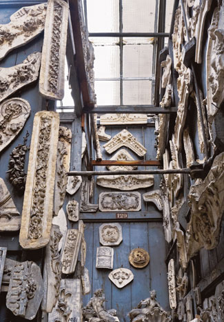 The bohemian-style atelier oozes history and invites exploration, even though it’s cold inside and traces of wood dust are scattered around. Most of the space is awash in light from the huge skylight, and order exists amid the chaos of haphazardly arranged priceless panels and doors that lean on top of one other like layers of history. Descending white stone stairs into the newly created and brilliantly lit “cave” reveals a massive collection of period fireplaces. The term “modern” has no relevance here.