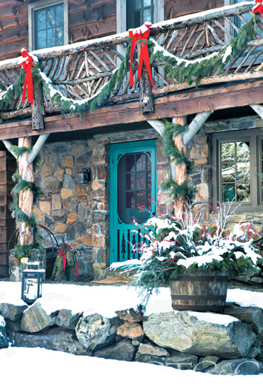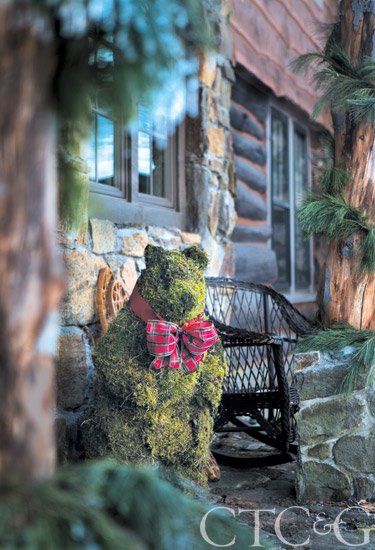 A moss bear—a year-round fixture and the lodge’s official greeter—sports a festive holiday bow.