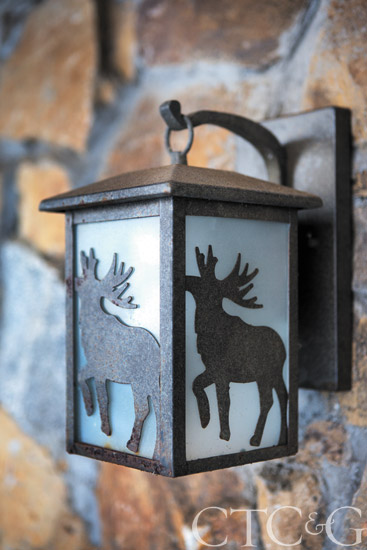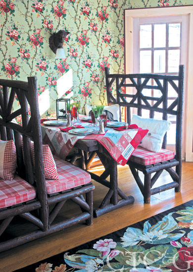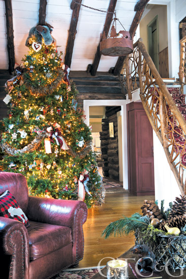 In the lodge’s original great room, a 13-foot tree is adorned with thousands of ornaments the designer has collected throughout the years. The stuffed moose atop the tree was a gift from a friend; it hides the cable that attaches the tree to a permanent hook in the ceiling.