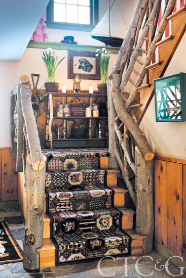 The log stair railings in the entry exemplify the home’s rustic appeal.