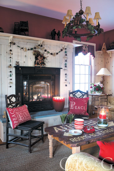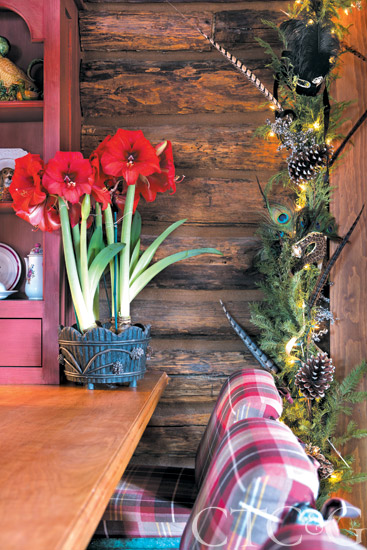 With its red kitchen and woodsy interior, the house lends itself to Christmas.