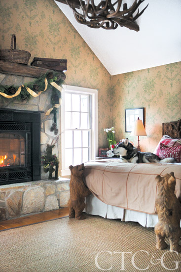 Bandit, Ellsley’s Alaskan Malamute, finds a cozy spot in the master bedroom, where a pair of carved bears seem to be holding up the foot of the bed.