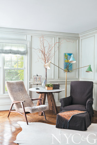 In the office/den, a cowhide rug is paired with a shearling-covered wood-framed chaise from Eric Appel and a linen-slipcovered armchair from Lucca & Co.; the 1950s floor lamp is from Gaspare Asaro.