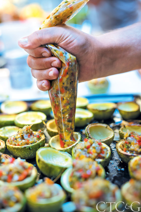 Stuffing is piped into zucchini shells for one of the several vegetable sides offered with the main course.