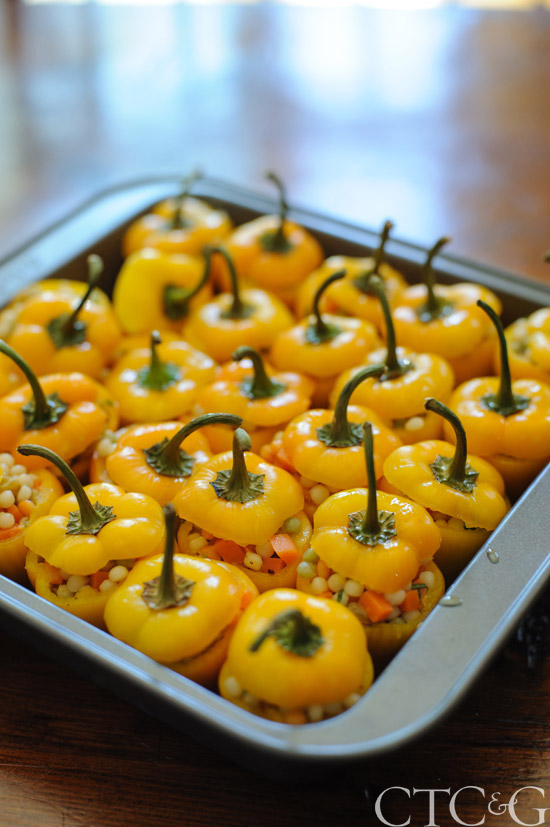 Yellow peppers are stuffed with a mixture of Israeli couscous, carrots and golden raisins.
