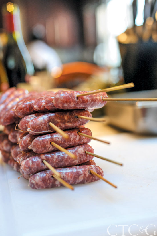 Chipolata sausage is stacked and ready for the grill