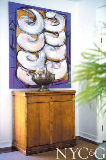 In a hallway, a 19th-century Biedermeier cabinet is topped by a brass bowl, set against an abstract canvas purchased at a flea market.