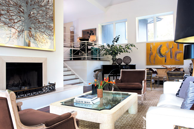 Guests enter the living room from a staircase that leads down from the foyer, giving visitors an early indication of the home’s eclectic interiors.