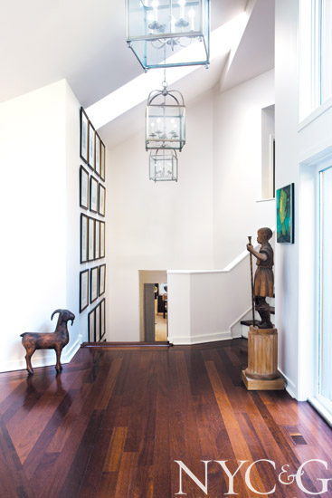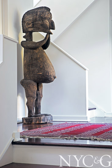 The entry foyer of a multilevel house in Greenwich presents the unexpected, including a sculptural goat and another of a shepherd seemingly in search of one. When guests reach the bottom of the staircase, they are greeted by a large African fertility figure.