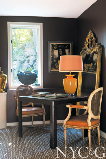 A 19th-century gilded French mirror leans against a chocolate-brown wall in the library.