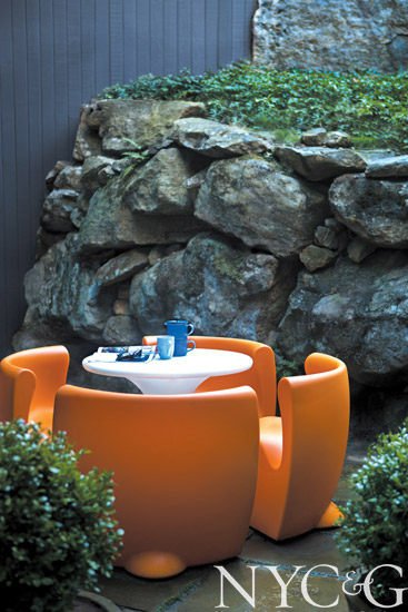 The interior courtyard incorporates some of the site’s rocky outcropping; it’s a contemplative space set with a midcentury modern table and chairs.
