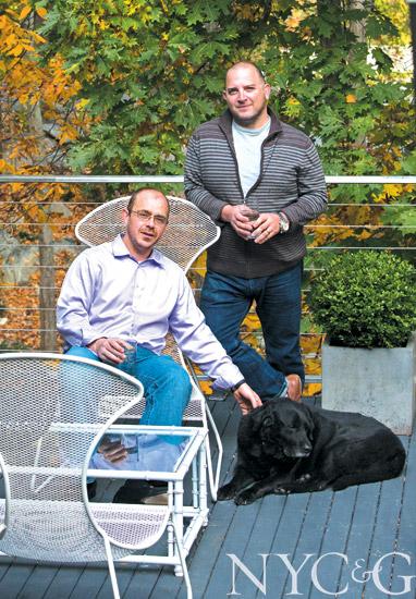 The owners, Michael Tubis (standing) and Dr. Stuart Bentley, pose with their dog, David.