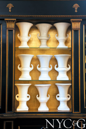 A 1950s Regency-style cabinet proves ideal for displaying a collection of ceramic flower vases
