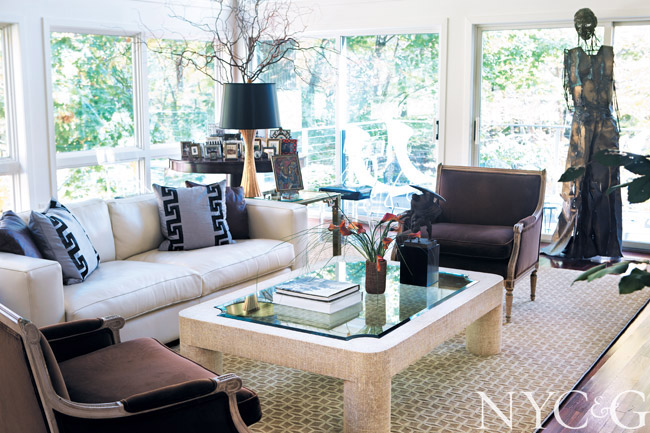 The main seating area in the living room features a leather couch from ABC Carpet with throw pillows inspired by a pair of Greek key–motif chairs that the homeowners found at a flea market. The glass-topped coffee table is circa 1970.