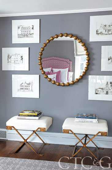 Drawing—in more than one way—inspiration from neighboring homes, Joan Cone’s pen-and-ink drawings add an antique touch to Carey Karlan’s guest bedroom.