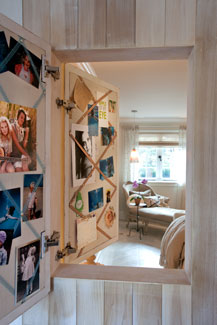 We couldn’t fit it in the January issue, but this idea was too great to not tell our readers about it! In “Well Manored” (CTC&G January), the paintings in each of the girl’s rooms open up to reveal a window in between. Early on in the construction of the house, the girl’s mentioned how much fun it would be to have this opening between their rooms. The Googes didn’t want a literal window, so they made this compromise instead. Designer Anne-Marie Barton’s daughter (and Linda’s niece) Tessa, who lived with the family for four months during the renovation, was the artist who created the paintings on either side. “Tessa has always been very close to our girls, so it was only natural that she was asked to make a special painting for each Amanda and Zoe,” says Linda. On the back of the paintings, fabric, tack board and ribbon were applied so the girls could hang pictures and notes for one another too. “It is great when they have friends over,” says Linda. “They open the ‘window,’ put music in the middle and have one big party.”