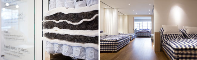 When you arrive in the boutique, you are guided through four zones: first, a traditional Hästen’s bed, then the Heart section, Sleep Spa, and finally, the Personalization area. Within each zone you can put your senses to work trying out an array of materials, firmness and choosing colors and textures.