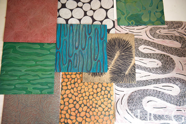 Each handmade print can go through the process several times. More linocut layers might be called for, or Heatley might decide to introduce other media such as collage, stencil, or paint or gouache. “I have to lay down some layers to see where it’s going,” she says. “It has to be intuitive.”