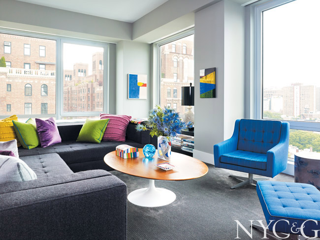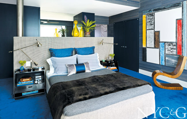 Wilson bought the Chelsea duplex several years ago, before he and Sanders became a couple. “I had been living on the Upper West Side,” he remembers, “but downtown seemed a lot more exciting. I wound up picking an unfinished unit with three walls of glass and views everywhere.” Those vistas to the east, west, and south encompass some of the great landmarks of New York City, including the Hudson River, the Statue of Liberty, and the new World Trade Center.