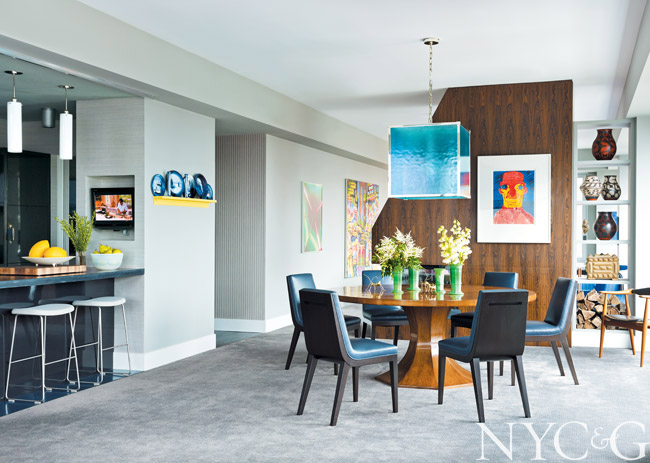 While most of the main living space is wrapped in soft platinum gray tones and gray wall-to-wall carpeting, there is a lot of color in the furniture and accessories, particularly blue. “I love blue and turquoise,” Sanders says. “Blue was my mother’s favorite color, and we always had blue houses. I associate it with everything good about being home.”
