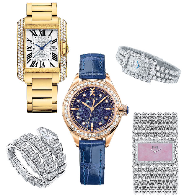 clockwise from top left: GOLDEN TOUCH Cartier’s automatic movement Tank Anglaise watch features an 18k yellow gold case set with brilliant cut diamonds and an 18k yellow gold bracelet, small, $32,900, medium (shown), $47,800, 653 Fifth Ave., NYC, 212-753-0111, cartier.com. SIMPLY SPARKLING L’Heure du Diamant watch in 18k white gold with 416 diamonds, price upon request, Chopard, 709 Madison Ave., NYC, 212-223-2304, chopard.com. PRECIOUS TIME Piaget Couture Precieuse cuff watch in 18k white gold with pink opal dial and brilliant cut diamonds, price upon request, 730 Fifth Ave., NYC, 212-246-5555, piaget.com. SNAKE CHARMER Bulgari’s Serpenti quartz watch in 18k white gold with white mother-of-pearl dial and 18k white gold spiral cuff bracelet set with round brilliant cut diamonds, price upon request, 730 Fifth Ave., NYC, 212-315-9000, bulgari.com. BLUE BOOK Ebel’s Onde watch in 18k rose gold with diamond bezel, lapis lazuli gemstone dial and cabouchon, and blue alligator strap, $18,500, at Joseph Edwards, 501 Fifth Ave., NYC, 212-730-7300, ebel.com/us.
