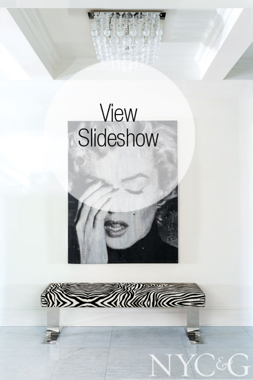 “The owners are young and cooler than you might imagine,” says Cohler. “When we started, the husband said, ‘We like patterns, so let’s have a lot—pattern on pattern.’” The Cohler team was happy to oblige, starting with a signature graffitied Jimmie Martin “Imperfect” cabinet in the vestibule and an abstract zebra print on a bench under the nearby Russell Young silkscreen of Marilyn Monroe. Some of the pattern is purely textural, like the carpets. The living room rug has a high-pile/low-pile modified Greek-key motif, a floral in the paneled study lends a feminine touch, and a geometric in the dining room sounds a modern note in the apartment’s most traditional room.