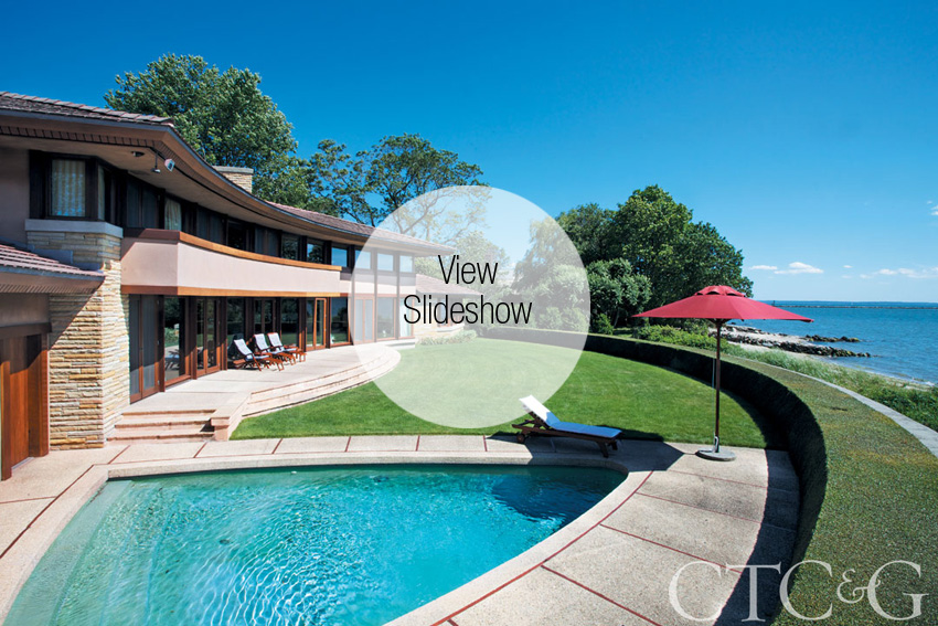 When he bought the Shippan Point house in 1997, the four-bedroom four-bathroom building was full of dated furnishings. “The rugs were dark, dark red. And the dining room table had these horrible Frank Lloyd Wright chairs that nobody can sit in for more than two minutes,” the homeowner says. So they brought in “the Italian stuff—light and summery oceanfront furniture.” A tile roof adds levity to the curving structure, while on the three-acre lot (the largest of a parcel originally belonging to the actress Marion Castle that was sequentially carved up over 100 years of inheritance taxes), “the largest circular driveway far and wide” connects the residence to the outside world.