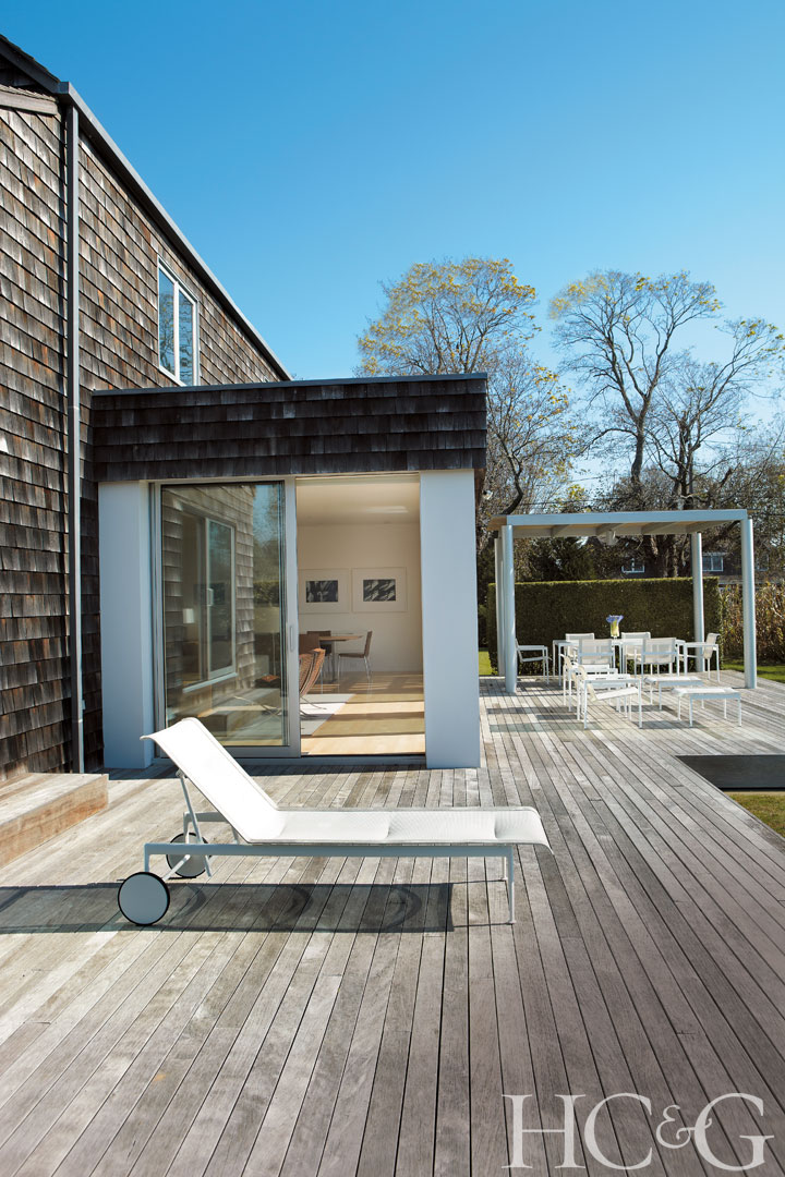 Outdoor furniture by Richard Schultz lends contemporary panache to Louise Patterson’s white-oak deck.
