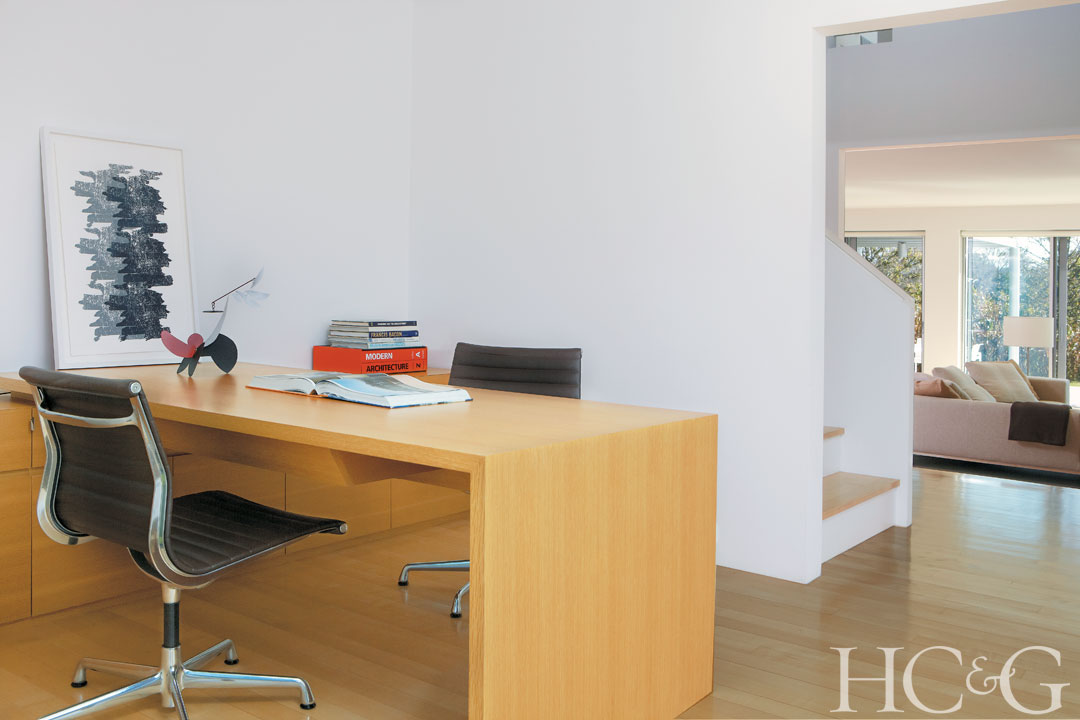 The study features a custom Carlos Otero white-oak desk and Eames Aluminum Group chairs.