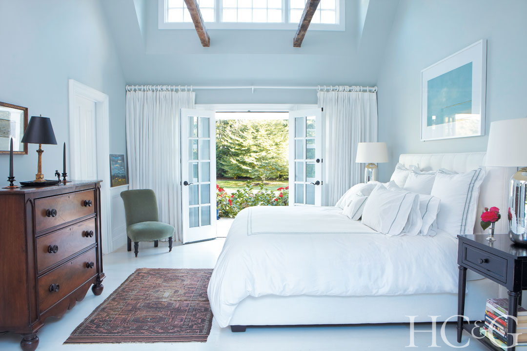 In the master bedroom, a Mitchell Gold + Bob Williams bed is flanked by lamps and night tables from Crate & Barrel. The slipper chair is from ABC Carpet & Home. The candlesticks on the dresser are from Neo Studio.