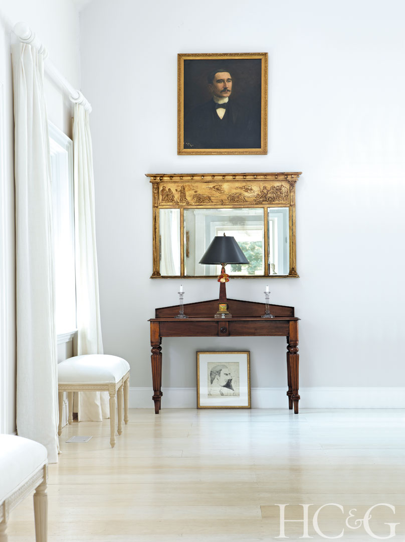 In another corner of the living room, a mirror from the Chelsea Antiques Market in London hangs above a hall table from Croft Antiques. The linen-upholstered, Gustavian-style benches are from English Country Antiques.
