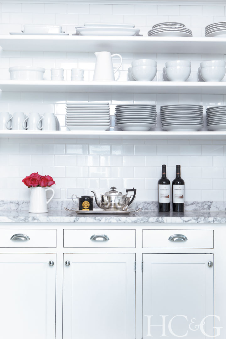 Carrara marble counters and Pottery Barn tableware complement the bright white kitchen’s cabinetry and flooring.