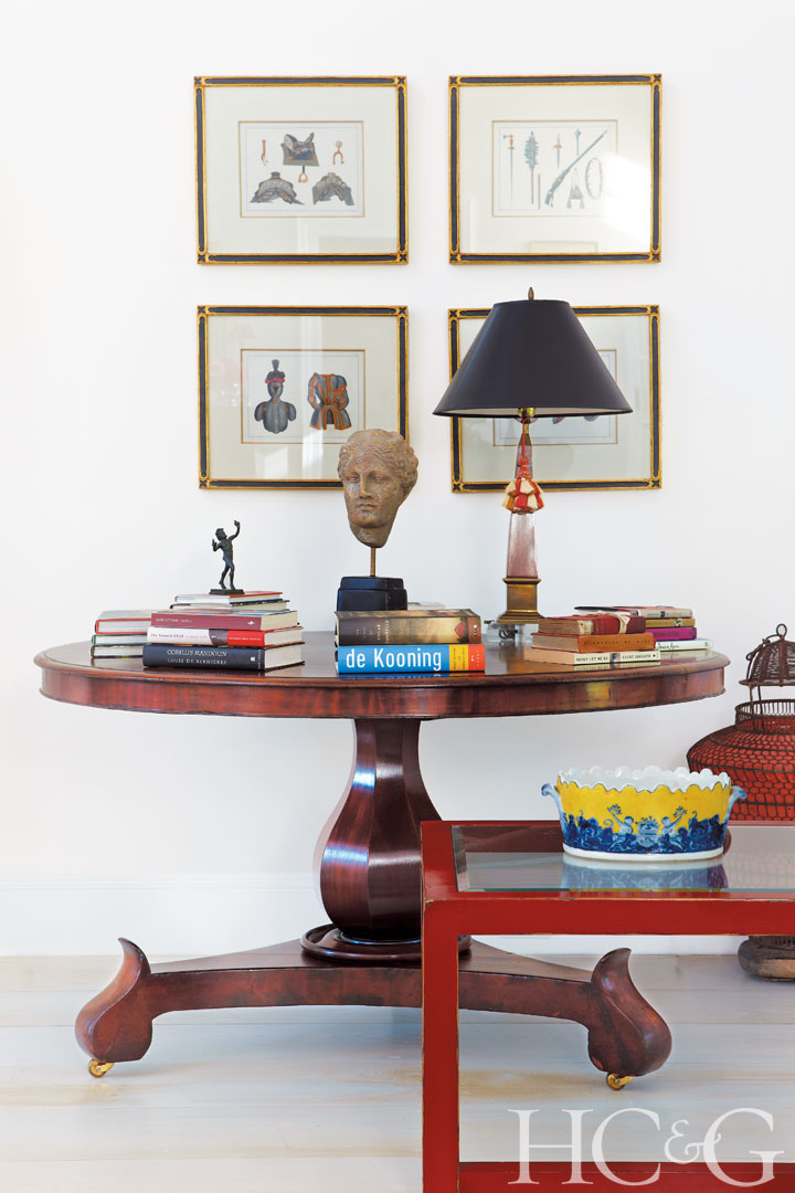 An obelisk lamp and a sculpted head from antiques dealer David Stypmann top a library table. The antique birdcage is from Lars Bolander and the red lacquer and glass side table is from Crate & Barrel.