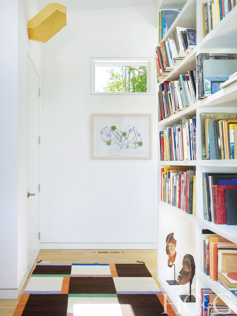 An abstract patchwork rug, based on one of Sonnier’s drawings, anchors the library/office, where a John Torreano sculpture is affixed to the wall.