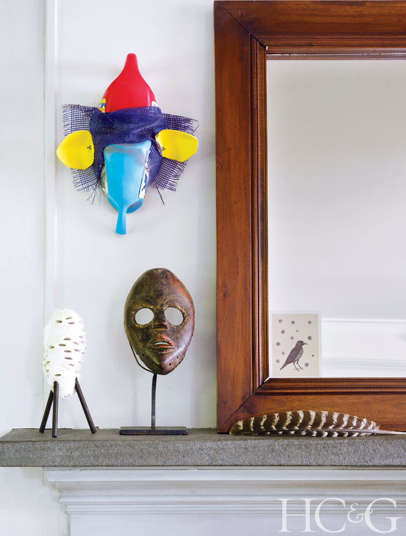Sonnier made the mask above the mantel from plastic detergent dispensers.