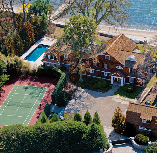 There’s a story behind this nearly 10,000-square-foot stone-and-shingle home. It started life at the turn of the last century as a Dutch Colonial seaside cottage. Age has its privileges: Its first owners grabbed a spectacular stretch of private waterfront, now measuring 200-plus feet. The home was renovated in 2008, retaining some of its charming antique details—there are brick-faced fireplaces in the bedrooms, for instance—but also enhanced with top-of-the-line fixtures and furnishings. The kitchen has a 60-inch Wolf range, two refrigerators, a wood-burning pizza oven, and two walk-in pantries. The master suite has a private deck, a fireplace and a glorious spa bathroom featuring a sauna and a freestanding copper-and-nickel “slipper” tub, positioned with views over Long Island Sound. In all, the interiors offer five bedrooms and eight full bathrooms (plus one half bathroom). On the 1.37-acre grounds: a tennis court, expansive stone terraces with a pool, and pretty lawns overlooking the water. It’s listed with M & D Properties, affiliated with Coldwell Banker in Westport. 203-227-8427.