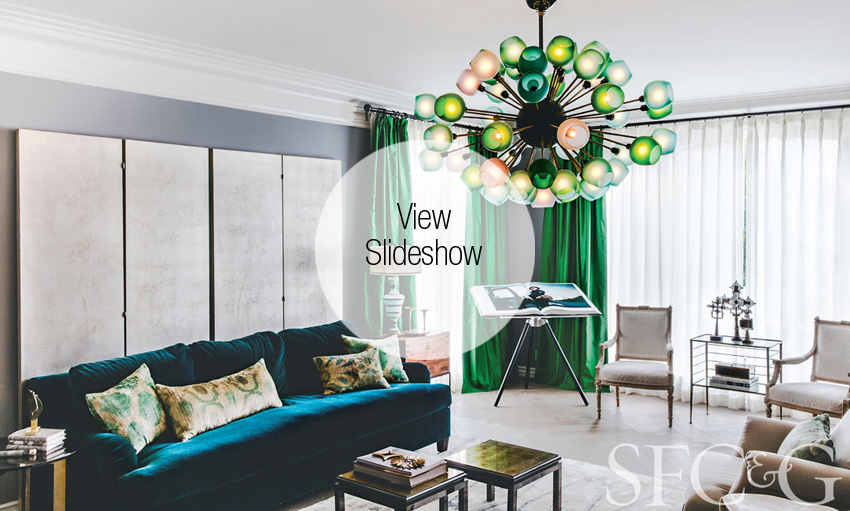 In the living room, bold swaths of color take center stage. Floor-to-ceiling emerald green silk window panels are a dramatic foil to a showstopping hand-blown Venetian chandelier. Smith, who always knew she wanted a Sputnik chandelier in that very spot, instantly acquired the vivid blue and green glass piece the minute she saw it at San Francisco designer Will Wick’s shop, Battersea. A jewel-green Holland & Sherry mohair covers a classic roll arm sofa that is surrounded by matte wood and glossy lacquer side tables. And by the expansive windows, a pair of delicate 18th-century Italian armchairs that have been with Smith as she moved from home to home flank a diminutive vintage bar cart side table.