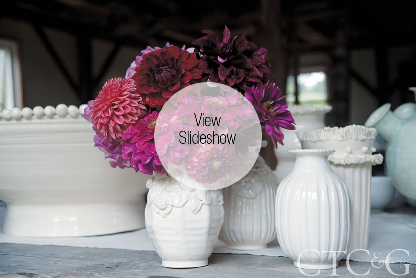 Frances is constantly in motion as she gathers items and fills orders, carefully packing each piece. She feels that gardening and ceramics are a metaphor for life: “The principles you follow apply to everything: raising children, relationships. I try to treat everything with respect.” Why are dahlias so predominant in her garden? “I love all flowers. But it amazes me that there are hundreds and hundreds of dahlias, and each one is so perfect. They have great longevity: Once they start blooming, they go all the way until frost. And they’re very happy!”