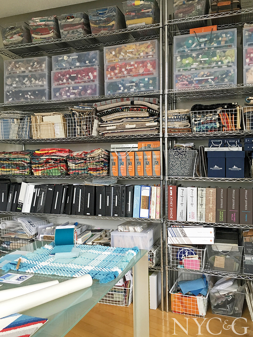 Fabric samples, paint chips, rug braids, and other tools of the trade are neatly organized in binders and bins.