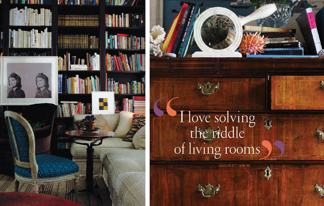 things flawless, orderly and well maintained. How do you describe your unique American perspective? I see the rooms I create as “modern”—using traditional furniture, but in an optimistic, clear-headed, enlightened way that reflects the times we live in. You say you mesh decorating and design. What is the difference? Decorating is the point of purchase: “I love that lamp, I’ll take it.” Design is participating in the creation of something that was not there when you started: One plus one equals three. You sometimes provide decorative art in a room. Why do you draw the line at fine art? If the client wants to collect, I can point them [in the right direction]. But fine art helps define the owner. It’s there to give them pleasure, not to complement the sofa. What is it like to work with high-profile clients? There is a confidence that comes in their ability to articulate who they are. They’re fully formed, fully defined people who understand the power of creativity. You maintain that the trick to working with color is confidence. What is your favorite color? I love amethyst, it’s very mysterious, has great depth. And in the last few years, Persian blue has been enormously compelling: But it’s only as good as the amethyst bowl that sits next to it. Which room do you enjoy working on most? I love solving the riddle of living rooms. Ninety percent of people tell me they don’t use them, but it’s usually the biggest, most beautiful room in the house. It’s my job to get them in there. I take big rooms and create more intimate space for human interaction and the ability to communicate: It’s a hallmark of a lot of my work.