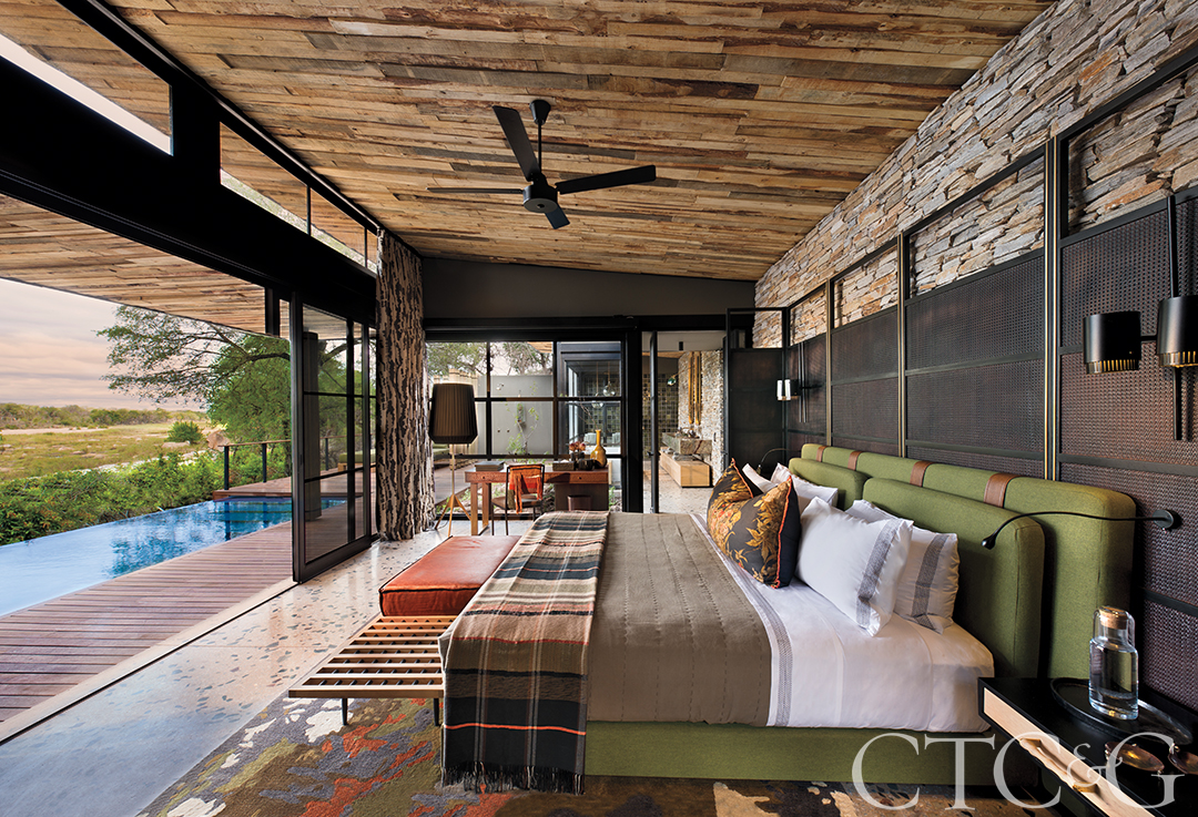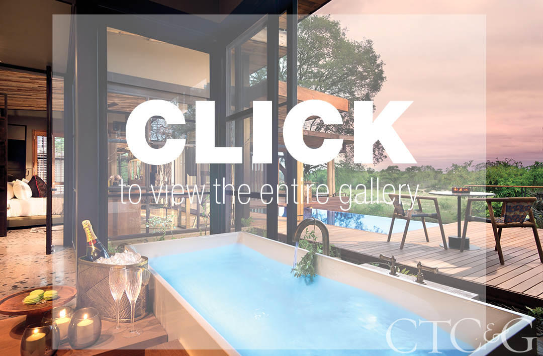 The next morning, I stepped off the 40-minute Airlink flight from Johannesburg and saw animals roaming freely. We really were in a different world! As we approached the Tengile River Lodge in Sabi Sands Reserve, our luxurious home base, we marveled at 100 impalas that crossed in the distance. The entrance to this new lodge is not obvious and that’s how andBeyond, which runs the lodge (along with 30 other safari lodges across Africa), intended it. The company’s respect for the land and its people (it supports local schooling as well) is admirable. You descend down a flight of stairs into the open dining and bar area, complete with a deep veranda and expansive views of the river below.