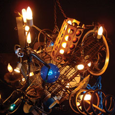 Calipers, wheels, wooden mallets, deer antlers, candy dishes, an entire Mini Cooper are among the objects Warren Muller assembles into fantastic, sculptural lighitng fixtures destined for museums, offices, restaurants and private homes.