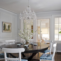 In this designer's rambling tudor, high-end fashion and glamour meet kid-friendly furnishings and finishes